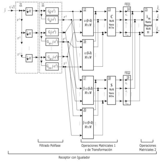 El receptor propuesto en la invención (figura 1) comprende un sistema de retardo de la señal de entrada y decimado (downsampling) de las señales retardadas (bloque 21). Tras este bloque, diversas ramas pueden ser sumadas unas con otras, mediante un procedimiento de solapamiento y suma. Así mismo, comprende un procesamiento de las señales resultantes a través de un algoritmo rápido mediante operaciones matriciales (bloques 12, 16, 17, 20, 15), de transformación del tipo transformada discreta del seno y/o coseno (bloques 13, 18), y filtrado polifase (bloque 11), cuyos filtros se pueden implementar con estructuras directas, o transpuestas, o en celosías.